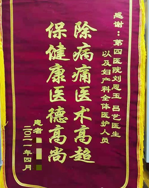 董女士帶著一面錦旗來到了婦產(chǎn)科,表達(dá)自己深深的謝意,她說:“感謝四院婦產(chǎn)科對(duì)我的幫助,讓我最大限度減少創(chuàng)傷,尤其出院以后的這段時(shí)間,主任和呂醫(yī)生也一直關(guān)注我的恢復(fù)情況,定期為我換藥,督促我加強(qiáng)護(hù)理。我心里特別感激!”
