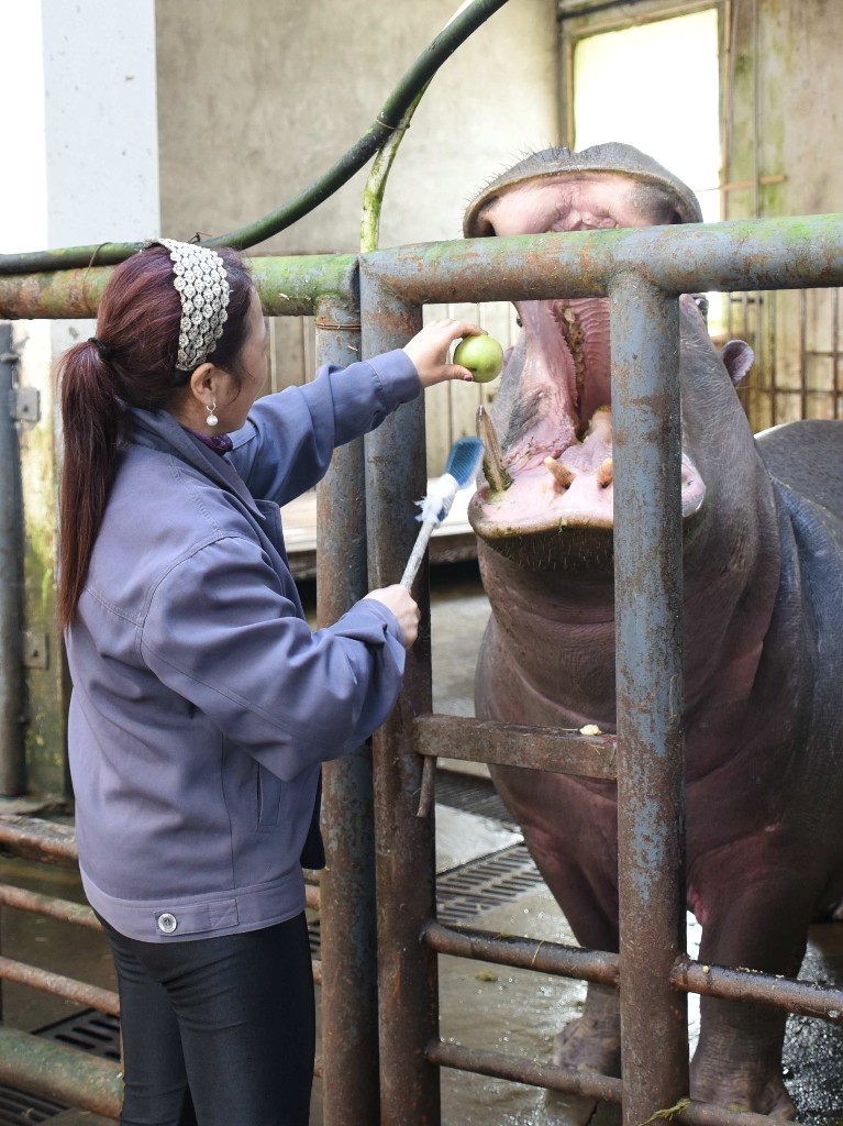 對于成年河馬除了身高體重測量,還要多加一項口腔檢查。看看那張陸生哺乳動物中最大的嘴里,口腔、牙齒是否健康。為更好觀察細節(jié)會先給河馬刷牙,河馬們對這種健康又舒適的特殊服務(wù)十分歡迎。