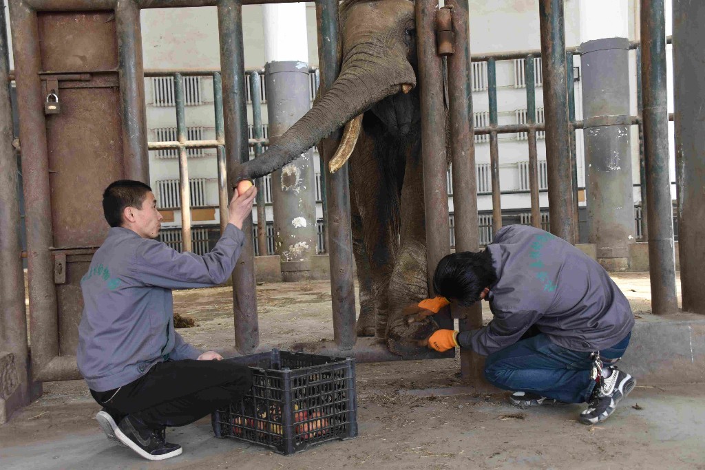 非洲象“豆豆”今年11歲,還在長身體。這次體檢發(fā)現(xiàn),一個冬天“豆豆”個子長了6cm,體重長了150kg,牙齒長長,腿長粗,腳也長大了。更讓“豆豆”喜歡的是,量完腳還有專業(yè)的修腳服務(wù)。
