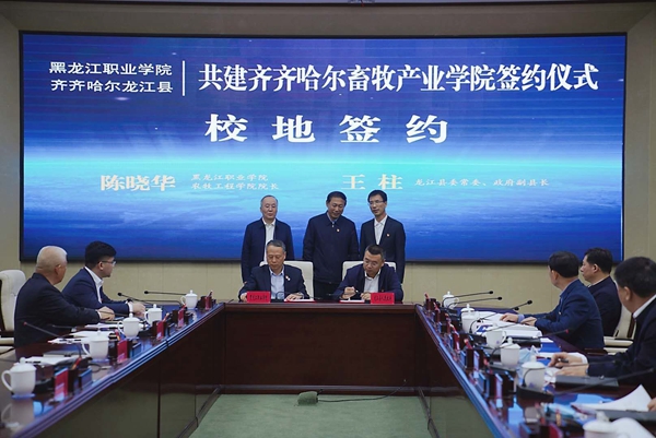黑龍江經(jīng)濟(jì)網(wǎng)訊(李福山 王鴻儒 記者魏伯勤)為搭建校地校企合作平臺(tái),聚焦產(chǎn)業(yè)人才短板,接軌應(yīng)用型院校人才培養(yǎng)體系,建立產(chǎn)業(yè)人才聯(lián)合培養(yǎng)機(jī)制,4月28日,黑龍江職業(yè)學(xué)院與龍江縣人民政府“共建齊齊哈爾畜牧產(chǎn)業(yè)學(xué)院”簽約儀式在齊齊哈爾市仙鶴賓館舉行。這次簽約是齊齊哈爾市“校企政”合作的一次有益探索,是產(chǎn)業(yè)人才培養(yǎng)、產(chǎn)教融合的新路徑、新載體,是推動(dòng)齊齊哈爾全市畜牧業(yè)高質(zhì)量發(fā)展的一項(xiàng)重要舉措。