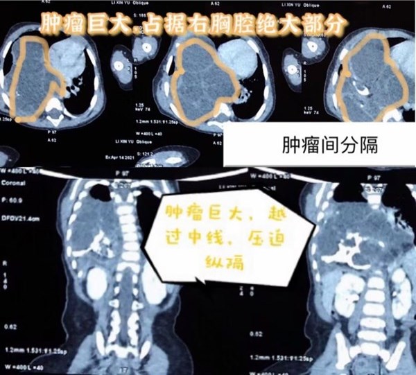 一周前,小彤彤因?yàn)闅獯?、呼吸困難、惡心在當(dāng)?shù)蒯t(yī)院就診,胸片檢查提示隔膨升可能,為了明確診斷來到哈爾濱市兒童醫(yī)院心胸外科就診。戚家峰副主任為孩子進(jìn)一步進(jìn)行查體考慮是縱隔腫瘤,通過胸部CT增強(qiáng)造影檢查更加清晰的看到腫瘤的特殊性,該腫瘤幾乎占滿右側(cè)胸腔,縱隔被擠壓后導(dǎo)致移位,心臟、食管均有不同程度的受壓影響。而且這個巨大的腫瘤由很多分隔組成,分隔中含有的物質(zhì)又不同,有囊性組織、實(shí)性組織和鈣化組織,考慮畸胎瘤可能。