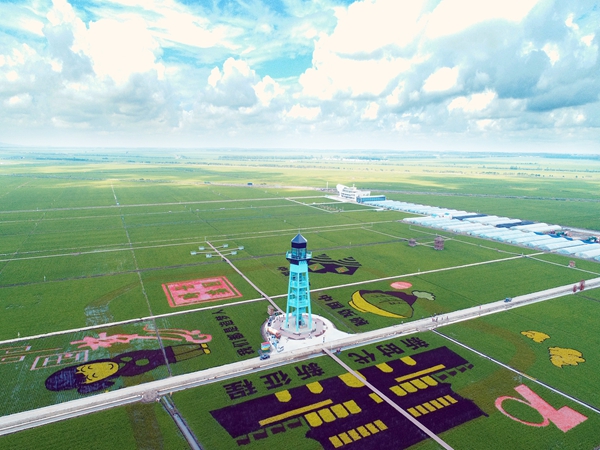 富錦市萬(wàn)畝水稻公園稻田畫(huà)航拍(圖片由黑龍江省文旅廳提供)