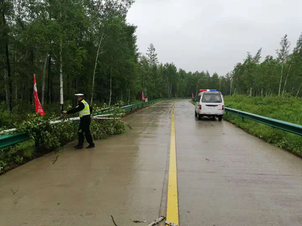 交警大隊派出警力增援北極中隊,擴大巡邏范圍,及時排查發(fā)現(xiàn)G111、G331國道、景區(qū)周邊路段交通隱患。在北極村至北紅村路段,發(fā)現(xiàn)由于暴雨沖刷,該路段3處山石、樹枝堆積在路面,2處樹木刮倒,嚴重影響路面通行安全。巡邏民警立即對險情進行處置。針對3處漫水較為嚴重區(qū)域,設(shè)置警戒線等警示標志,告知過往車輛通行路況,提醒車輛減速慢行,同時通知相關(guān)部門及時處置。