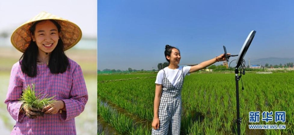 拼版照片:左圖為程玉嬌在太原市晉源區(qū)三家村水稻田里;右圖為程玉嬌在水稻田里進行直播(7月9日攝)。今年24歲的程玉嬌2019年留學回國后,選擇了返鄉(xiāng)創(chuàng)業(yè)發(fā)展稻魚菜綜合種養(yǎng)農業(yè)。晉源區(qū)三家村出產的大米遠近聞名,程玉嬌在社交平臺上開通了雙語直播,在科普水稻知識的同時拓展銷售渠道,不僅生意做得風風火火,自己也變成了小有名氣的“網紅”。