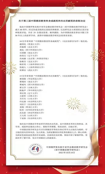 今年恰逢黑龍江大學建校、黑龍江大學俄語學院建院80周年。八十年來,眾多德才兼?zhèn)涞膬?yōu)秀教師為黑大俄語專業(yè)建設(shè)、為中國俄語教育事業(yè)發(fā)展貢獻了畢生力量。李錫胤教授、華劭教授與張家驊教授曾獲“中國俄語教育終身成就獎”,鄭述譜教授與金亞娜教授曾獲“中國俄語教育杰出貢獻獎”。此次潘國民教授與龍翔教授榮獲表彰,再次肯定了黑龍江大學老一輩俄語教師對國家俄語教育事業(yè)發(fā)展做出的突出貢獻。