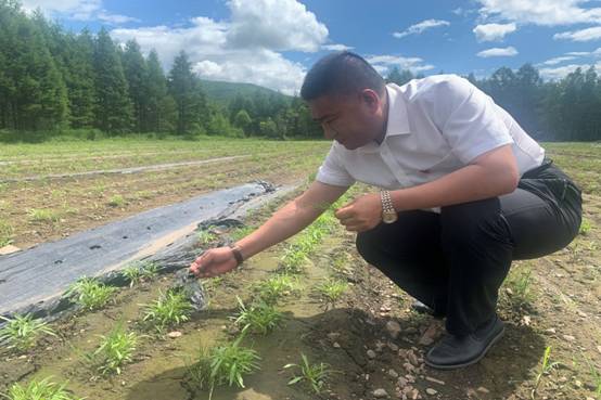圖為關(guān)成國在古源林場(chǎng)興安雪菊種植基地查看雪菊長(zhǎng)勢(shì)情況(魏樹強(qiáng)/攝)