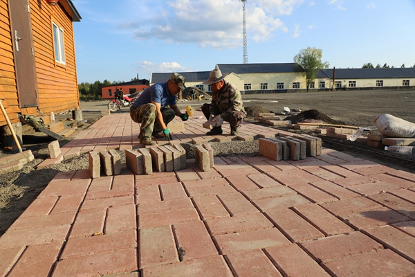 阿木爾林業(yè)局職工為龍河林場(chǎng)驛站民宿鋪地磚(王力 攝)