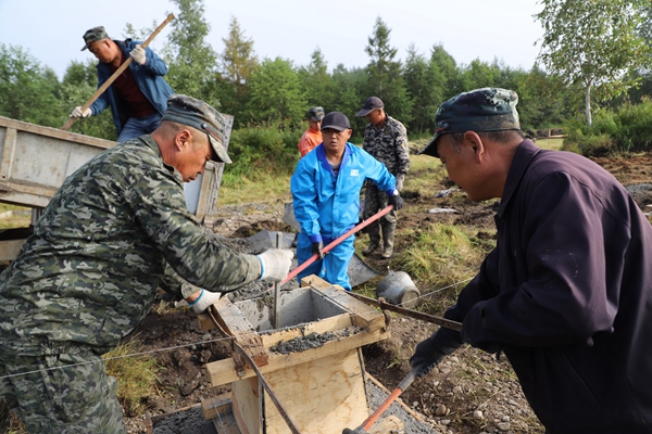 阿木爾林業(yè)局職工為興安林場(chǎng)精品民宿打T型混凝土方墩底座(王力 攝)