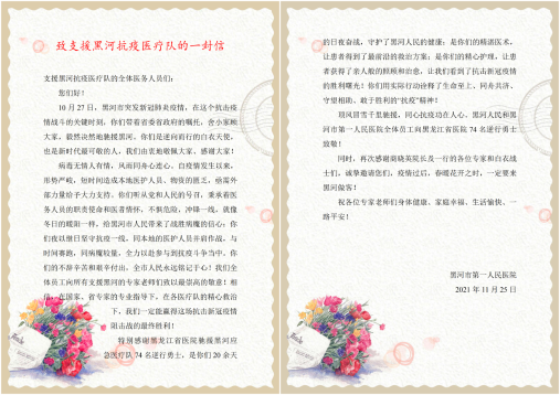 據(jù)介紹,省醫(yī)院支援黑河應(yīng)急醫(yī)療隊共收治新冠肺炎患者69人,其中重癥1例,最小的患者2歲,最大的患者90歲,在兄弟單位接手前,共治愈出院35人。治療期間,醫(yī)療隊收到了多封患者表揚信,小患者們則用畫筆表達(dá)了對天使們的感謝與敬仰,有的未出院患者聽說省醫(yī)院醫(yī)療隊要離開了,都依依不舍,紛紛表達(dá)對醫(yī)療隊精湛的醫(yī)技和暖心醫(yī)療的感謝。
