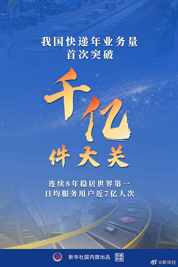 12月8日,國家郵政局快遞大數據平臺實時監(jiān)測數據顯示,2021年我國快遞業(yè)務量已達1000億件,這是我國快遞年業(yè)務量首次突破千億級別,已連續(xù)8年穩(wěn)居世界第一,日均服務用戶近7億人次。(新華社記者戴小河 海報設計楊軼群)