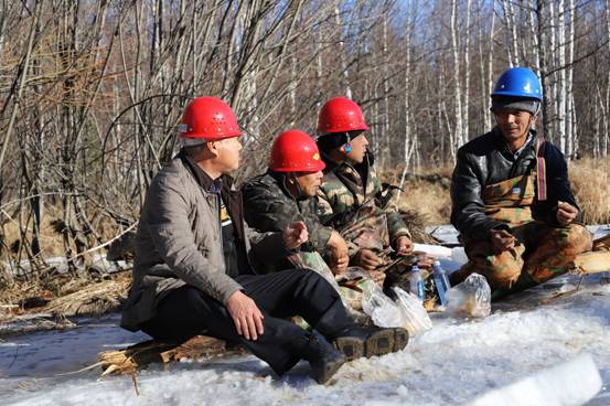 阿木爾林業(yè)局多種經營公司干部職工在修復水毀橋時利用歇息時間研究下步工作(王力 攝)