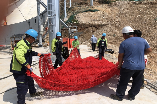阿木爾林業(yè)局產業(yè)職工楊輝(左一)與其他職工在國家跳臺中心安裝防護網(wǎng)。