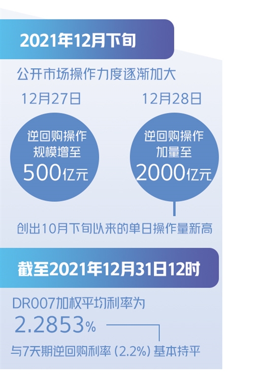 2021年末,中國(guó)人民銀行連續(xù)“加碼”公開市場(chǎng)操作。2021年12月31日,人民銀行發(fā)布公告稱,為維護(hù)年末流動(dòng)性平穩(wěn),當(dāng)日以利率招標(biāo)方式開展了1000億元逆回購(gòu)操作,期限為7天,利率維持在2.20%。這已是央行連續(xù)4個(gè)工作日開展千億級(jí)逆回購(gòu)。