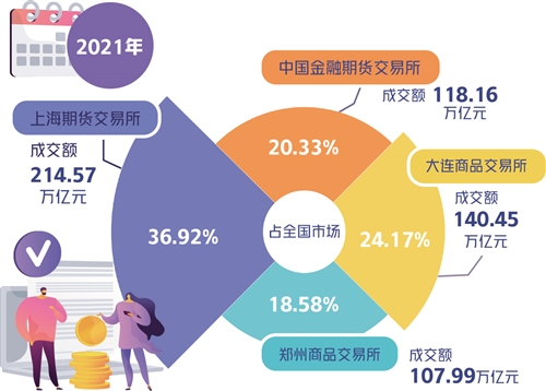 數(shù)據(jù)顯示,上海期貨交易所2021年成交量為24.45億手,成交額為214.57萬(wàn)億元,同比分別增長(zhǎng)14.9%和40.4%,分別占全國(guó)市場(chǎng)的32.55%和36.92%。