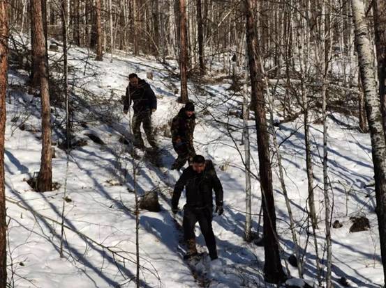呼中林業(yè)局森林資源管理科工作人員在密林中進(jìn)行“三清”巡護(hù)(劉玉龍 攝)