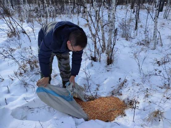 呼中林業(yè)局森林資源管理科工作人員山間為野生動(dòng)物投放食物(劉玉龍 攝)