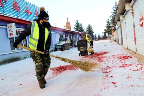 黑龍江經(jīng)濟(jì)網(wǎng)訊(王力 記者馬朝林)天剛蒙蒙亮,呈現(xiàn)眼前的是大年三十夜晚燃放的鞭炮紙屑,遍地開(kāi)花,仿佛是紅地毯一樣。多名環(huán)衛(wèi)工冒著零下30多度的嚴(yán)寒,不顧帽子、眉毛結(jié)滿冰霜,有的用掃帚清掃,有的撿拾紙屑煙頭,有的推移垃圾箱……