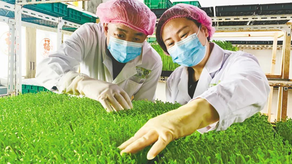 楊帆夫婦在查看芽苗菜長勢(shì)。 姜立偉 攝