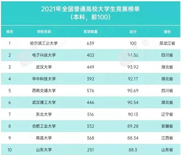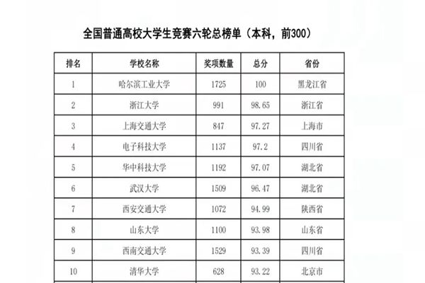 哈爾濱工業(yè)大學以獲獎數(shù)量1725項、總分100分的絕對優(yōu)勢獲得全國普通高校大學生競賽六輪總榜單冠軍。