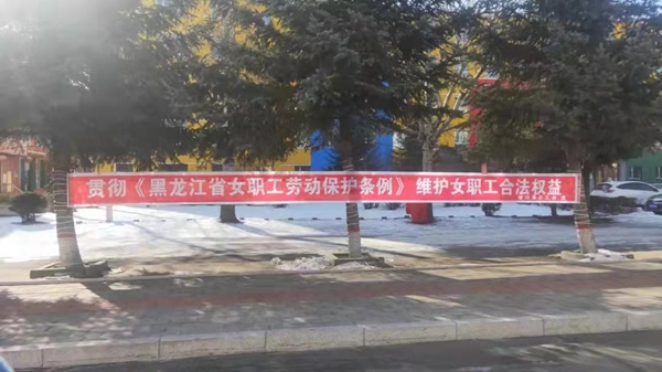 在主要街道懸掛“貫徹《黑龍江省女職工勞動保護條例》 維護女職工合法權(quán)益”宣傳條幅,提示廣大職工知曉《黑龍江省女職工勞動保護條例》,提醒、督促各單位認真貫徹執(zhí)行條例,維護女職工合法權(quán)益。