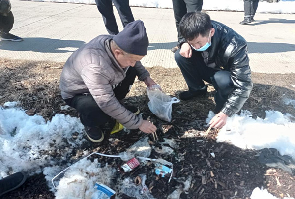 大烏蘇林場干部職工在市場集中區(qū)清撿煙頭(汝愛麗 攝)