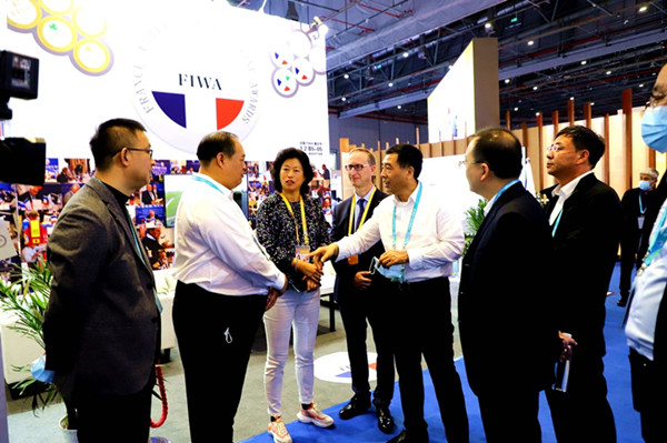 阿木爾林業(yè)局北極冰藍莓酒莊生產的冰酒、紅酒等產品,在第四屆上海國際進出口博覽會上展出。大興安嶺林業(yè)集團公司黨委副書記、總經理李軍(左五)與國際友人及林業(yè)局參展人員親切交談,了解酒莊產品特點、市場營銷等情況(王力 攝)