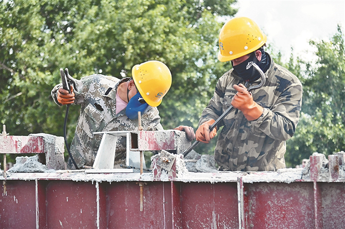 身處建設現(xiàn)場,記者聽到最美的聲音就是各種機器的嗡鳴。順著電鉆的嗡嗡聲,記者看向一棟3層建筑。劉明軍介紹,這棟建筑是身兼展示功能的辦公樓,正在進行外幕墻裝飾。與之相鄰的二層建筑上,工人們正忙著進行二次結構砌筑。