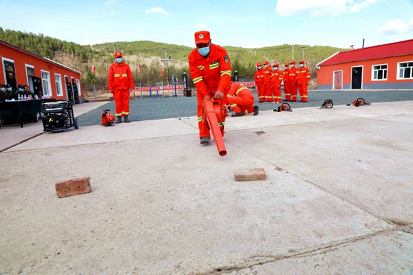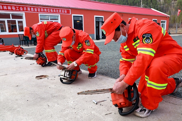 阿木爾林業(yè)局綠林林場專業(yè)撲火隊員在進(jìn)行風(fēng)力滅火機、油鋸的拆裝維修使用比賽(王力 攝)