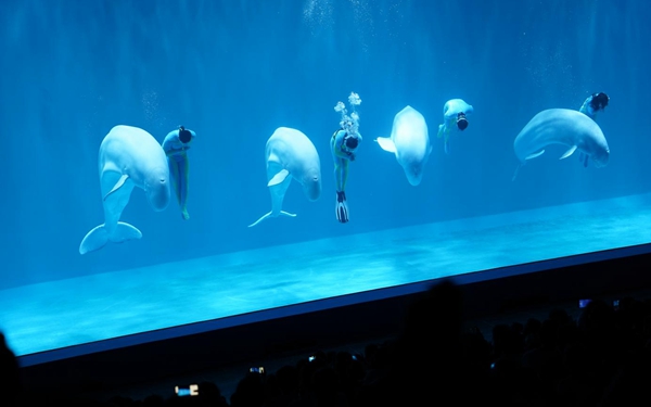 極地公園工作人員介紹,四鯨、四人共同表演難度很大,這樣一場震撼無比的表演,離不開白鯨寶貝們的高智商和高情商,以及白鯨和馴養(yǎng)師朝夕相處的和諧和默契。這場四鯨秀不僅內(nèi)容新,這四只白鯨也是第一次“組團(tuán)”,它們沒有任何緊張和怯場,超具藝術(shù)家風(fēng)范,最后還不忘集體謝幕,贏得了游客接連不斷的喝彩和掌聲。為了打造世界最好的白鯨表演,哈爾濱極地公園的白鯨劇場從場館設(shè)計、音樂編排、燈光音響設(shè)備,到巨型展窗等均做到國內(nèi)頂級,只為全方位打造世界最好的白鯨秀。