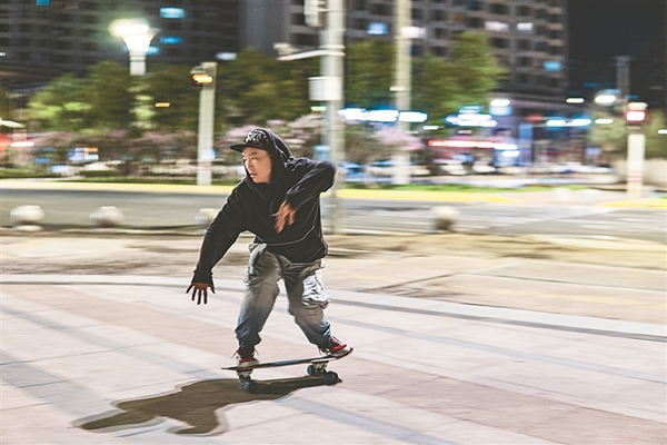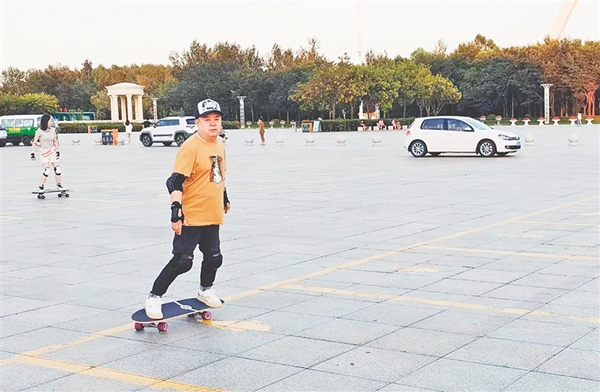 7月21日18時(shí)許,太陽島地鐵站出口附近的小廣場,一群人抱著陸沖板陸續(xù)趕到,其中“80后”“90后”居多,還有帶孩子來的“寶媽”。不少人來的時(shí)候穿著上班的職業(yè)裝,換上圓領(lǐng)T恤,戴上鴨舌帽,配齊護(hù)具,簡單熱身后,迫不及待地開滑。