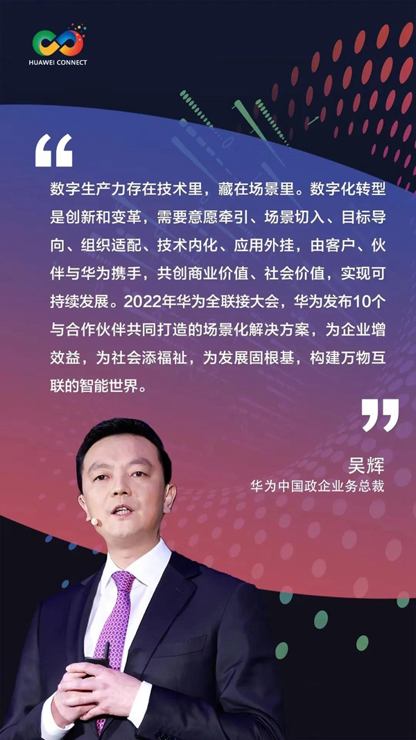 當(dāng)前,我國的數(shù)字化已經(jīng)進(jìn)入快車道,釋放數(shù)字生產(chǎn)力正當(dāng)其時(shí)。而“數(shù)字生產(chǎn)力就存在技術(shù)里,藏在場(chǎng)景里?!被诖?,華為中國政企業(yè)務(wù)總裁吳輝在會(huì)上發(fā)表了題為《為行業(yè)找技術(shù),深入場(chǎng)景創(chuàng)造價(jià)值》的主題演講,重點(diǎn)分享了華為基于多年的探索和實(shí)踐總結(jié)出的行業(yè)數(shù)字化轉(zhuǎn)型的方法論和企業(yè)轉(zhuǎn)型成功秘訣。