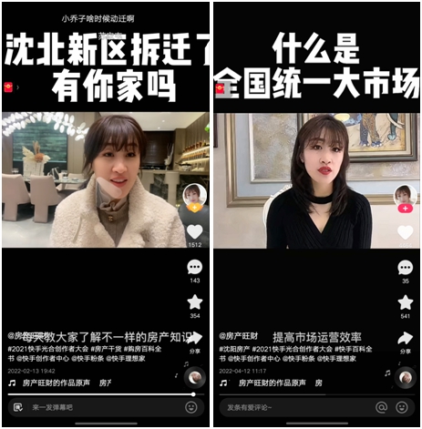 “現(xiàn)在整個(gè)沈陽(yáng)房產(chǎn)市場(chǎng)30%的成交額都是由快手主播提供的,當(dāng)?shù)氐拈_發(fā)商們也會(huì)經(jīng)常和快手平臺(tái)、快手主播合作宣傳,平臺(tái)對(duì)于房產(chǎn)行業(yè)的約束,也帶著當(dāng)?shù)胤慨a(chǎn)市場(chǎng)向更加正規(guī)化方向發(fā)展”。