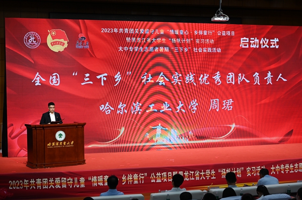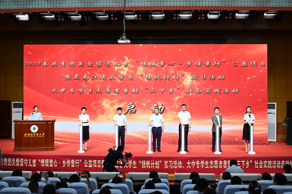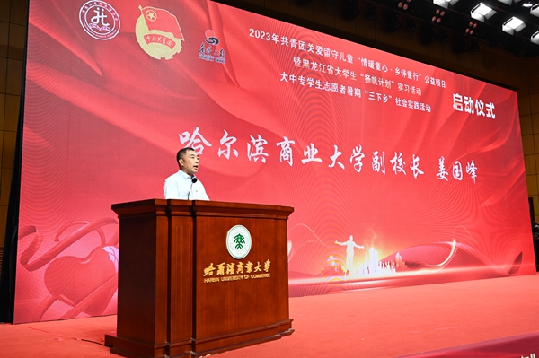 本次活動,在哈爾濱商業(yè)大學(xué)的大力支持下順利開展,哈爾濱商業(yè)大學(xué)副校長姜國鋒在儀式上致辭,他說:“學(xué)校建校71年來,立足立德樹人根本任務(wù),聚焦‘為黨育人,為國育才’的職責(zé)使命,在不斷加強(qiáng)‘第一課堂’建設(shè)的同時,還依托學(xué)?!惑w兩翼’文化育人模式,充分發(fā)揮實(shí)踐育人的作用,通過開展‘三下鄉(xiāng)’‘返家鄉(xiāng)’等社會實(shí)踐和‘西部計劃’‘興邊富民’志愿服務(wù)項目,引導(dǎo)廣大青年學(xué)生堅持用習(xí)近平新時代中國特色社會主義思想凝心鑄魂,在社會的課堂中‘受教育、長才干、作貢獻(xiàn)’?!被顒蝇F(xiàn)場,播放《黑龍江省希望工程30年與光同行》和黑龍江省大中專學(xué)生志愿者暑期“三下鄉(xiāng)”社會實(shí)踐活動宣傳片,與會領(lǐng)導(dǎo)上臺共同啟動了“情暖童心·鄉(xiāng)伴童行”公益項目、大學(xué)生“揚(yáng)帆計劃”實(shí)習(xí)活動、大中專學(xué)生志愿者暑期“三下鄉(xiāng)”社會實(shí)踐活動。