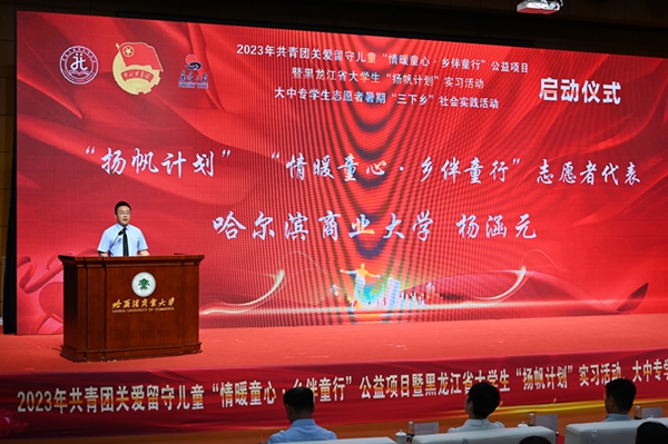 黑龍江經(jīng)濟(jì)網(wǎng)訊(王丹陽 記者祝東)7月5日,2023年共青團(tuán)關(guān)愛留守兒童“情暖童心·鄉(xiāng)伴童行”公益項目暨黑龍江省大學(xué)生“揚(yáng)帆計劃”實(shí)習(xí)活動、大中專學(xué)生志愿者暑期“三下鄉(xiāng)”社會實(shí)踐活動啟動儀式在哈爾濱商業(yè)大學(xué)隆重舉行。共青團(tuán)黑龍江省委副書記代東力、陳海平,哈爾濱商業(yè)大學(xué)副校長姜國峰,省直機(jī)關(guān)團(tuán)工委書記趙明瑞,黑龍江省人力資源和社會保障廳、省知識產(chǎn)權(quán)局、省人民檢察院、省青少年發(fā)展基金會、哈爾濱市南崗區(qū)民政局、哈爾濱海關(guān)、哈爾濱海事局相關(guān)領(lǐng)導(dǎo),以及哈爾濱商業(yè)大學(xué)的志愿者和哈爾濱市樂業(yè)小學(xué)師生代表參加本次活動。