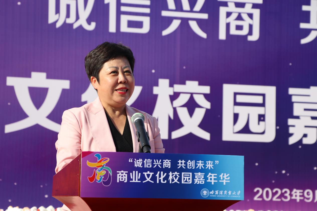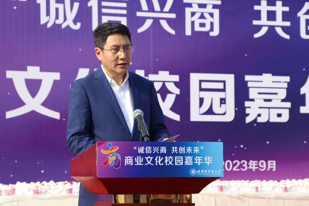 哈爾濱商業(yè)大學(xué)黨委書(shū)記孫先民致辭。他表示,誠(chéng)信“軟實(shí)力”為高質(zhì)量發(fā)展提供“硬支撐”。本屆“誠(chéng)信興商·共創(chuàng)未來(lái)”商業(yè)文化校園嘉年華活動(dòng)堅(jiān)持以文化力量啟智潤(rùn)心、固本培元,是深入學(xué)習(xí)貫徹習(xí)近平總書(shū)記在主持召開(kāi)新時(shí)代推動(dòng)?xùn)|北全面振興座談會(huì)和視察我省時(shí)的重要講話(huà)重要指示精神,全面落實(shí)立德樹(shù)人根本任務(wù)的務(wù)實(shí)舉措。哈爾濱商業(yè)大學(xué)作為新中國(guó)第一所多科性商業(yè)大學(xué),始終堅(jiān)持“大商鑄才、大雅育人、商雅兼?zhèn)?、?jīng)世濟(jì)民”的育人理念,厚植師生“心懷祖國(guó),至誠(chéng)奉獻(xiàn),以商弘業(yè),矢志一流”的大商之道?;顒?dòng)將充分發(fā)揮老字號(hào)在文化引領(lǐng)、品牌建設(shè)、產(chǎn)業(yè)升級(jí)等方面的示范引領(lǐng)作用,彰顯龍江市場(chǎng)主體活力與創(chuàng)新力,聚焦建設(shè)“六個(gè)龍江”、推進(jìn)“八個(gè)振興”,筑牢堅(jiān)定龍江文化繁榮發(fā)展的自信根基,進(jìn)一步凝聚師生扎根龍江、服務(wù)龍江、建設(shè)龍江的情懷和力量。