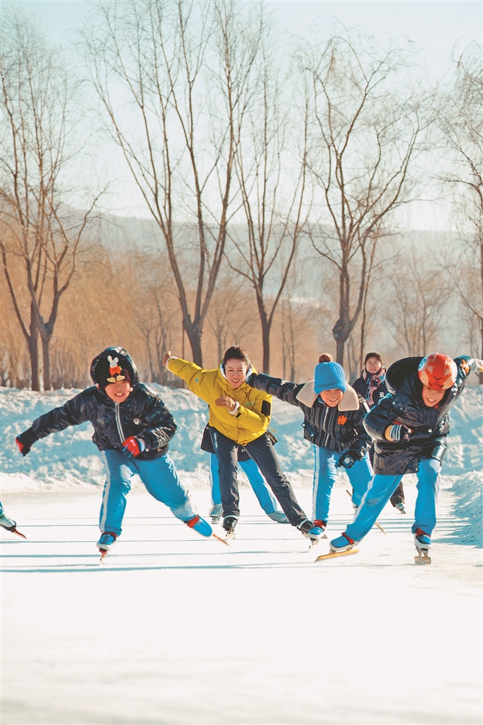 楊揚(左二)在冰場上輔導(dǎo)孩子們滑冰。 圖片由受訪單位提供