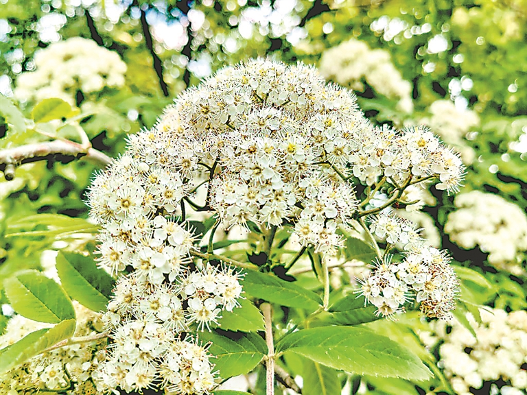 日前,哈爾濱市道里區(qū)松花江畔,四五棵花楸樹(shù)上,白色的花朵迎風(fēng)綻放,非常美麗,吸引許多游人觀看、拍照。