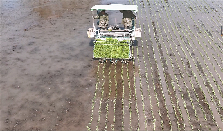 在樺南縣域內(nèi)的曙光農(nóng)場(chǎng)有限公司第三管理區(qū)水稻基地,種植戶們正忙著搬運(yùn)秧苗。伴隨著轟鳴的機(jī)器聲,農(nóng)機(jī)手駕駛著裝配有北斗導(dǎo)航系統(tǒng)的高速插秧機(jī)開展作業(yè)。插秧機(jī)駛過之處,一株株秧苗從苗盤上依次滑落,均勻有序地插播在水田里。插秧機(jī)上,工人不時(shí)為插秧機(jī)補(bǔ)充秧苗,不一會(huì)兒,整片水田披上了綠裝,一行行整齊有序、間隔適中的秧苗在陽光下煥發(fā)著勃勃生機(jī)。