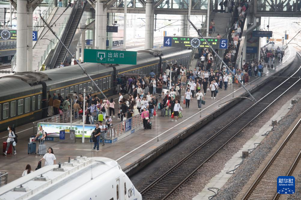 9月30日,旅客在山東煙臺站出站。新華社發(fā)(唐克攝)