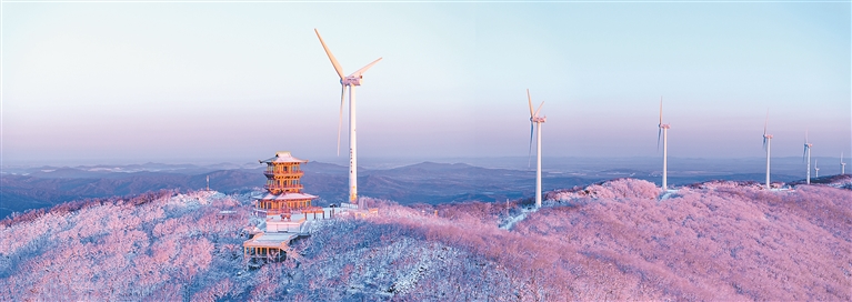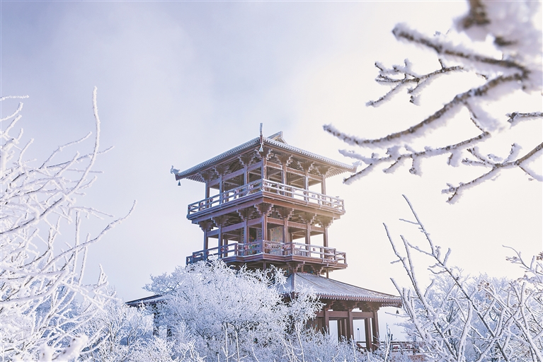 山林間云霧彌漫,白雪和蒼勁的虬枝映襯,山頂?shù)奶煊娱w和一個個白色巨人般的發(fā)電“風(fēng)車”相映成趣,將這座名山裝扮得更加素雅、更顯活力。近處,松柏全都凝霜掛雪,戴銀披玉。山頂原始次森林中,低矮的灌木叢也被積雪覆蓋,成為了一朵朵五彩的冰花。高大的樹木被輕盈的雪花點綴,晶瑩剔透,仿若玉樹瓊枝,隨風(fēng)搖擺,宛如仙境。