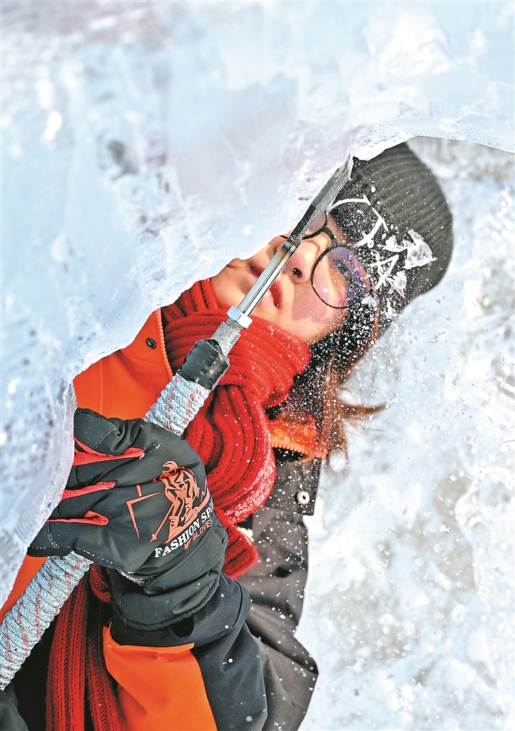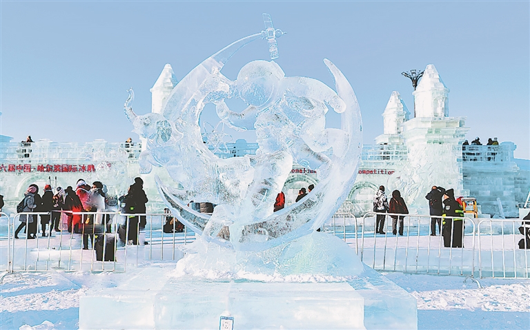 本屆比賽吸引了來(lái)自中、俄、美、法等12個(gè)國(guó)家的30支冰雕隊(duì)參賽?!毒聿赝ぁ芬詢和笾獮橹黝},用幼童勤奮讀書、與書為友的畫面,刻畫出其對(duì)知識(shí)的渴望。本報(bào)記者 郭俊峰攝