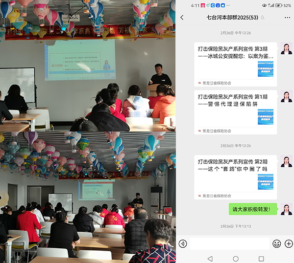 在此次打擊“代理退?!毙麄骰顒?dòng)中,七臺(tái)河中支利用微信工作群、微信朋友圈轉(zhuǎn)發(fā)宣傳內(nèi)容,詳細(xì)剖析了黑灰產(chǎn)的常見(jiàn)運(yùn)作模式,非法“代理退?!笨赡芙o消費(fèi)者帶來(lái)的四方面風(fēng)險(xiǎn):一是資金受損風(fēng)險(xiǎn);二是喪失正常保險(xiǎn)保障的風(fēng)險(xiǎn);三是個(gè)人信息泄漏風(fēng)險(xiǎn);四是相關(guān)行為可能導(dǎo)致消費(fèi)者面臨訴訟等法律風(fēng)險(xiǎn)。號(hào)召?gòu)V大群眾增強(qiáng)風(fēng)險(xiǎn)防范意識(shí),警惕非法“代理退?!碧茁贰?