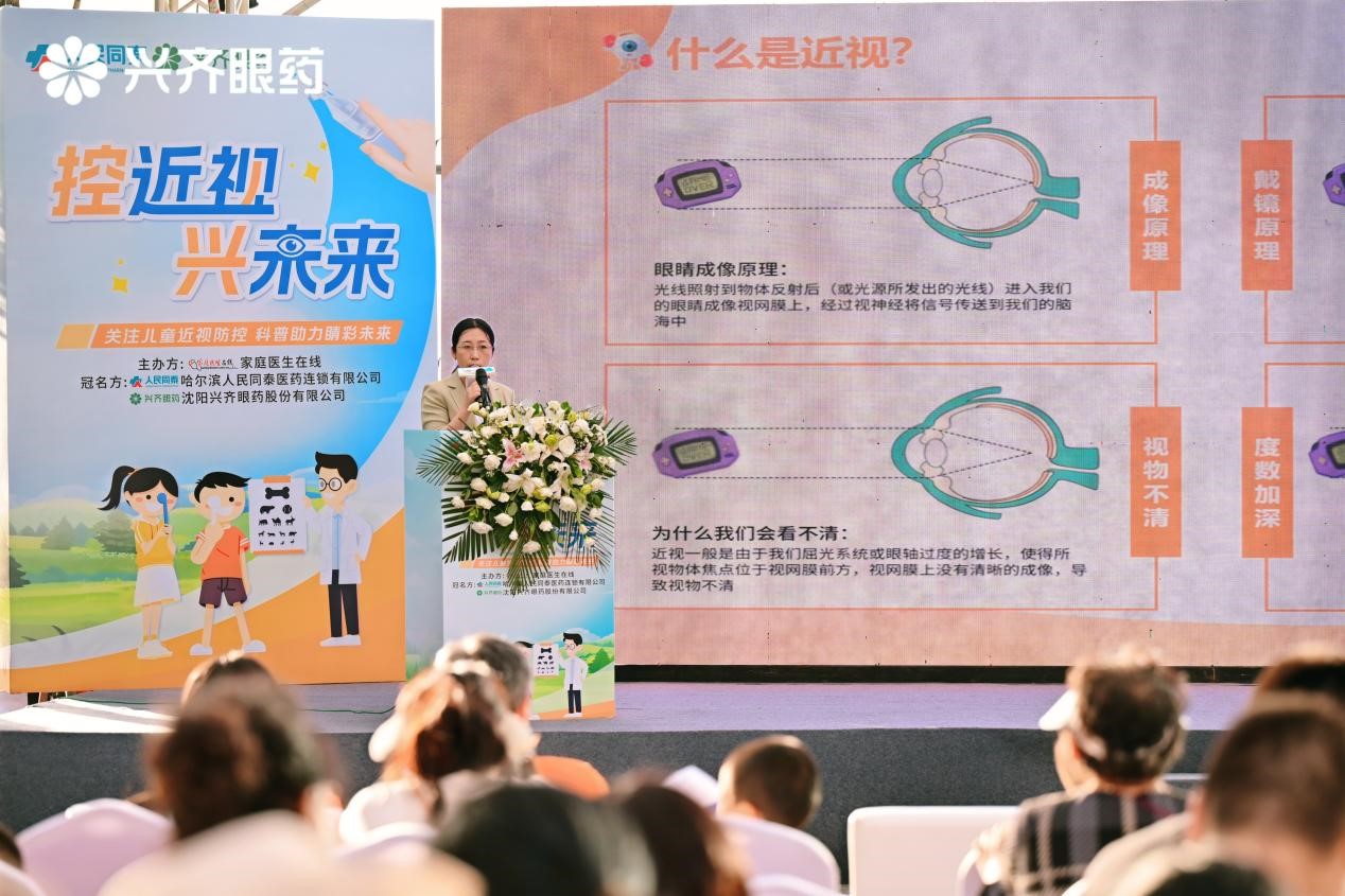 哈爾濱人民同泰醫(yī)藥連鎖有限公司副總經(jīng)理柴靜榮在致辭中直面近視低齡化、重度化挑戰(zhàn),強(qiáng)調(diào)企業(yè)踐行“打造卓越品牌、致力大眾健康”使命的責(zé)任擔(dān)當(dāng)。依托全省350余家社區(qū)門店網(wǎng)絡(luò)及線上線下一體化平臺,全力支持公益視力檢測、科普講座等行動,并發(fā)揮執(zhí)業(yè)藥師團(tuán)隊專業(yè)力量,使科學(xué)近視防控理念精準(zhǔn)觸達(dá)家庭場景。