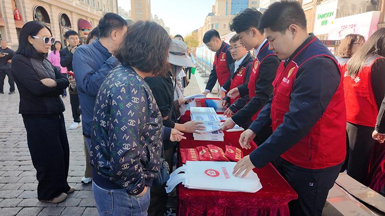 工作人員發(fā)放宣傳手冊、宣傳單