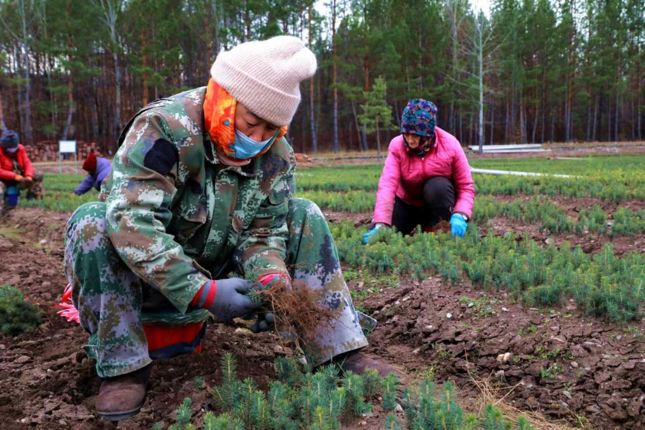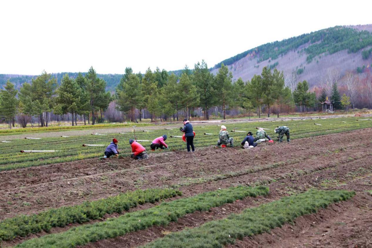 阿木爾林業(yè)局中心苗圃人員正在落葉松苗床緊張作業(yè)(王力 攝)