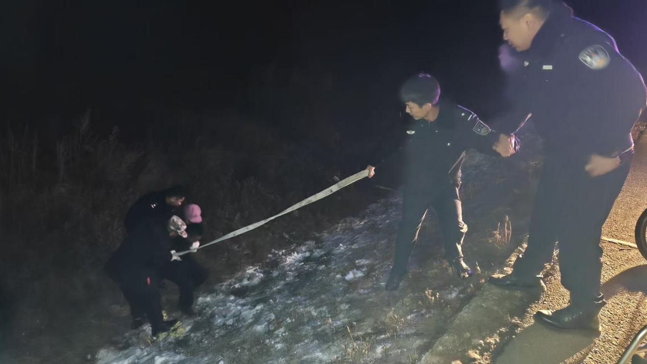 據(jù)了解,當(dāng)時(shí)呼瑪縣公安局興華派出所民輔警正對(duì)轄區(qū)開(kāi)展常態(tài)化巡查,發(fā)現(xiàn)一位群眾在路邊攔住警車(chē),民輔警立即停車(chē)查看情況。詢(xún)問(wèn)得知,該群眾的妻子乘坐電動(dòng)輪椅時(shí)由于天黑路滑不慎駛進(jìn)了深溝,因其妻子年過(guò)六旬身體殘疾且行動(dòng)不便,墜入深溝摔倒后無(wú)法起身,恰好此時(shí)看到巡邏的警車(chē),便立刻攔車(chē)尋求幫助。