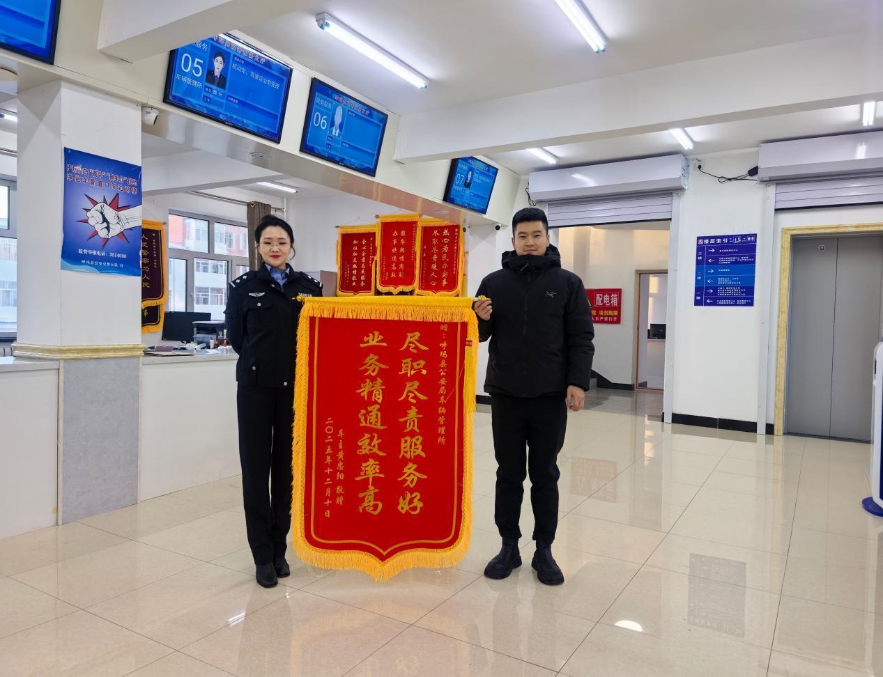 黑龍江經(jīng)濟(jì)網(wǎng)訊(婁暢)近日,一面寫著“盡職盡責(zé)服務(wù)好,業(yè)務(wù)精通效率高”的錦旗,被一位車主鄭重地送到了呼瑪縣公安局交通管理大隊(duì)車管所的辦事大廳。這面錦旗不僅是一份榮譽(yù),更是一段跨越兩地、高效協(xié)作的暖心故事的見證。